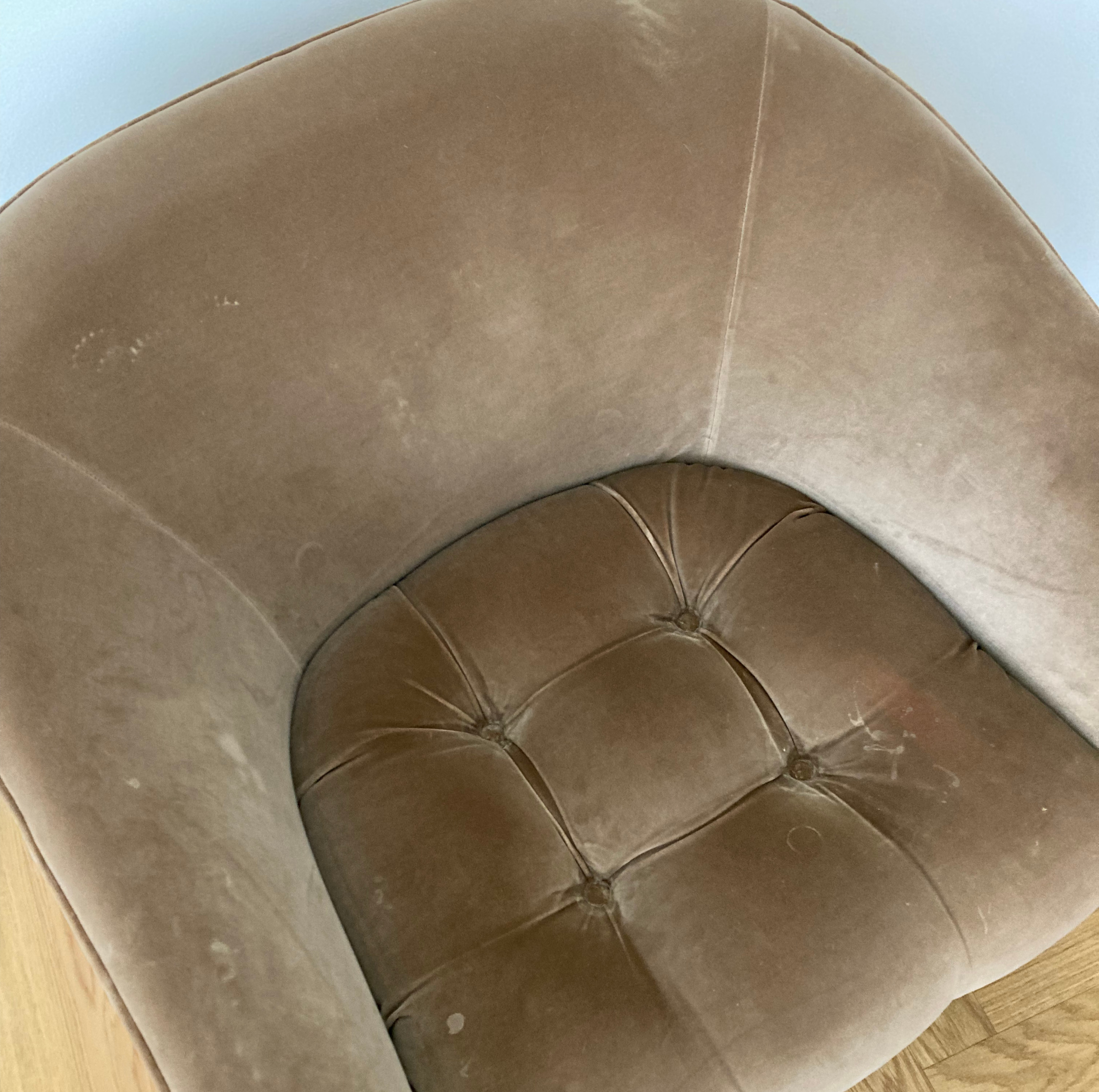 A higher-quality velvet is often made of cotton or cotton mix, but the lower-quality version might be made of polyester which tends to stretch easier and lose its shape faster than cotton. In polyester, you will often see the marks where you were sitting, and the fibers will follow the direction you pull your hand to. This will immediately give a stained feeling to the fabric even if it was completely clean.